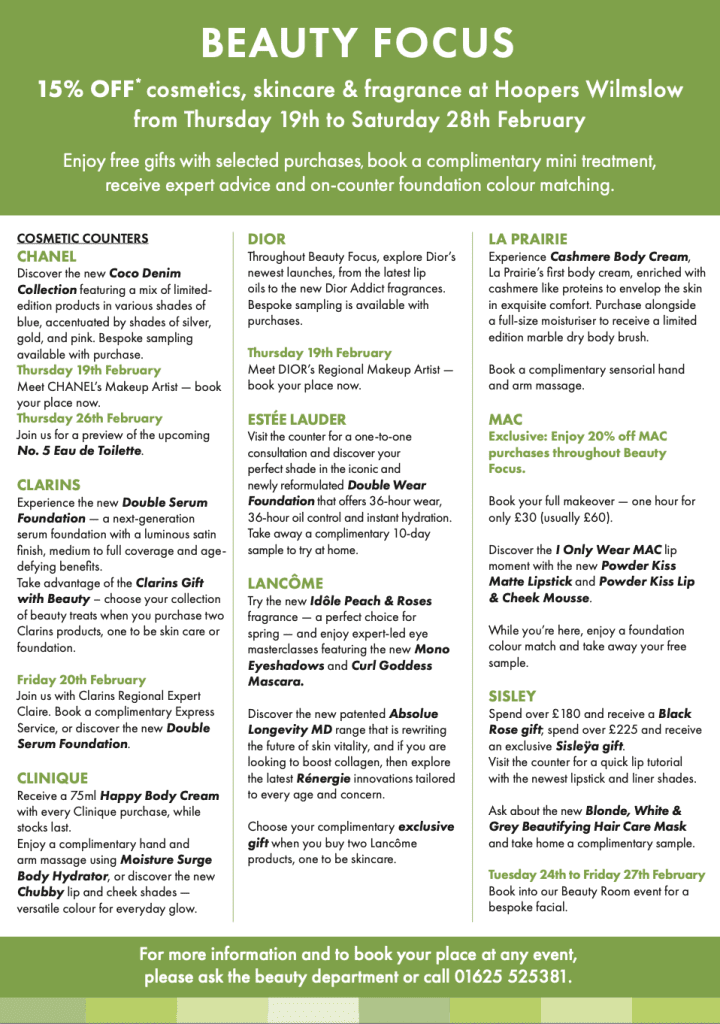 Hoopers Wilmslow is hosting Beauty Focus, a special in store event with 15% off cosmetics, skincare and fragrance, plus brand led experiences, expert appointments, complimentary mini treatments, gifts with purchase, and product previews across the beauty hall.
