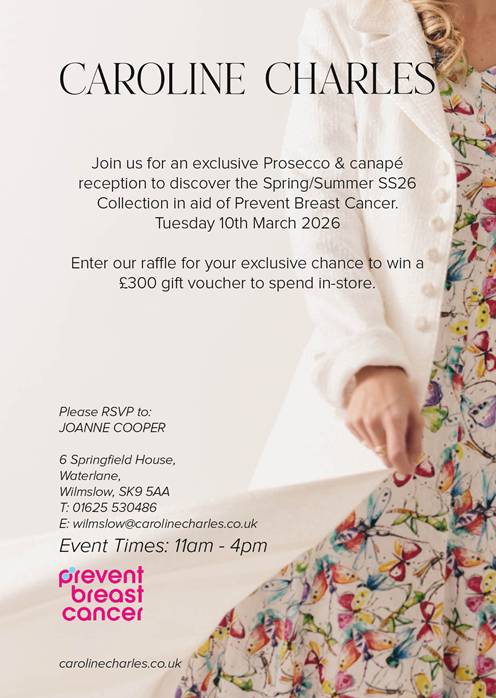 Caroline Charles in Wilmslow is hosting an exclusive Prosecco and canapé reception to showcase the Spring Summer SS26 collection, with the event supporting Prevent Breast Cancer. Guests can enjoy a relaxed in store preview of the new collection, and you can also enter the raffle for the chance to win a £300 gift voucher to spend in store.