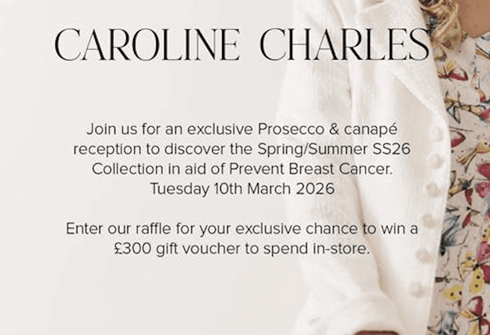 Caroline Charles in Wilmslow is hosting an exclusive Prosecco and canapé reception to showcase the Spring Summer SS26 collection, with the event supporting Prevent Breast Cancer. Guests can enjoy a relaxed in store preview of the new collection, and you can also enter the raffle for the chance to win a £300 gift voucher to spend in store.