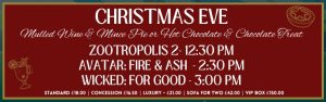 Afternoon sessions feature Zootropolis 2, Avatar: Fire & Ash, and Wicked: For Good — all with mulled wine, hot chocolate, mince pies, and chocolate treats.