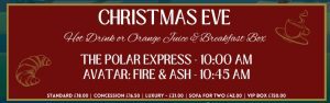 Morning shows include The Polar Express and Avatar: Fire & Ash with breakfast boxes.