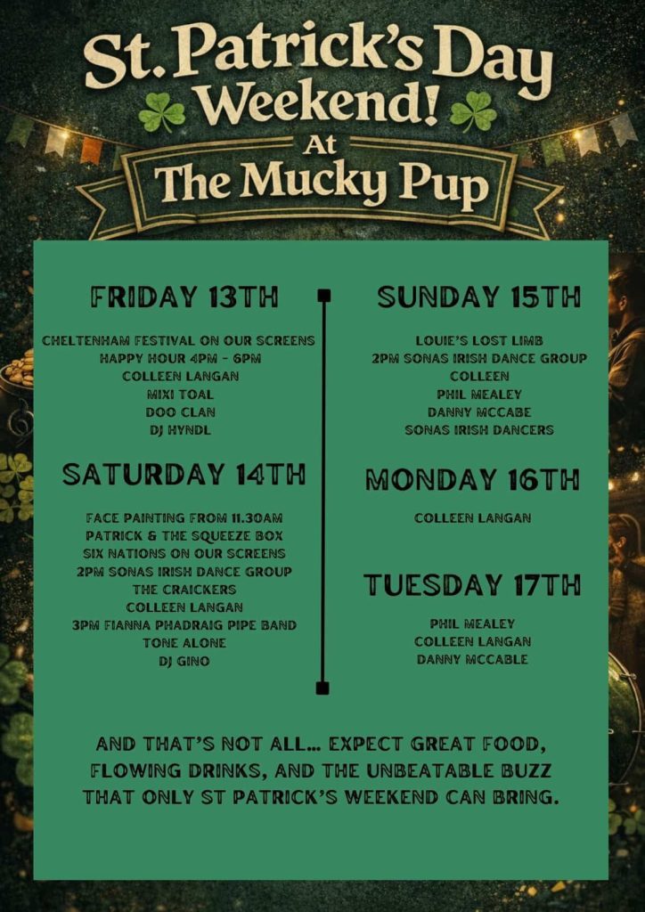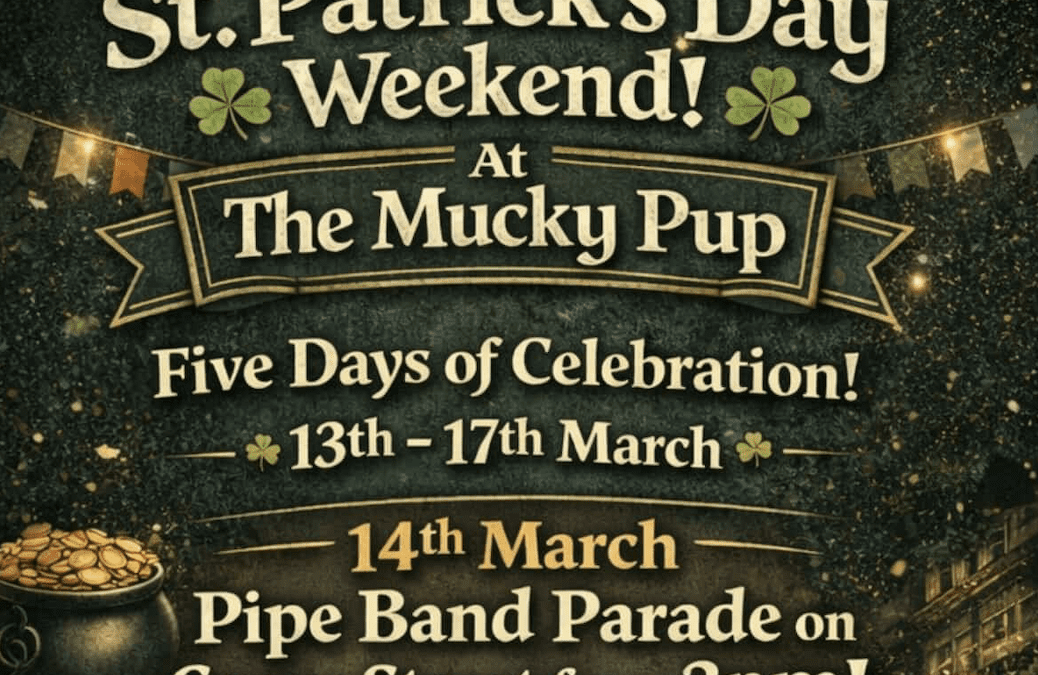 🍀 Get ready for five days of St Patrick’s celebrations at The Mucky Pup, packed with live music, Irish dancing, big sport on the screens, and plenty of great craic.