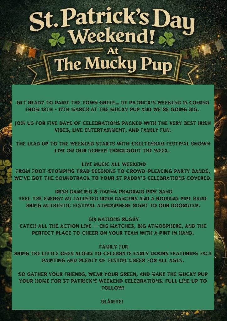 🍻 Expect: Great food, flowing drinks, and a proper St Paddy’s atmosphere all weekend Long story short, wear your green, bring your mates, and make The Mucky Pup your home for St Patrick’s celebrations. Sláinte!