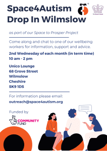 Every second Wednesday of the month, Space4Autism hosts a drop-in session at Unico Lounge, 68 Grove Street, Wilmslow, from 10 am to 2 pm. These sessions are part of the Space to Prosper Project, providing a relaxed environment where individuals can meet with wellbeing workers for support, advice, and information. Whether you’re seeking guidance or simply wish to connect with others in the community, these sessions are a valuable resource.